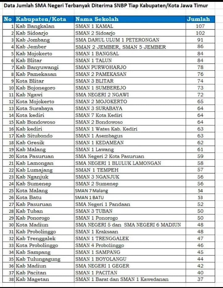 Tulisan ini lahir dari pengalaman melihat sistem dari dalam. Karena itu, persoalan ini tidak sesederhana angka yang dipublikasikan. Ada kecenderungan bahwa data capaian SNBP (seleksi Nasional berbasis prestasi)—yang seharusnya menjadi bahan evaluasi internal—justru terlalu cepat dibawa ke ruang publik sebagai tolok ukur utama kualitas sekolah. Caban Dinas Pendidikan di Wilayah Jawa Timur yang tegak lurus pada Kepala Dinas nya di Provinsi dan tentunya memberikan laporan kepada Gubernur Jawa Timur! Padahal, pendekatan semacam ini menyimpan risiko: penyederhanaan makna pendidikan menjadi sekadar angka. Contoh menarik muncul pada SMAN 3 Nganjuk (SMAGA). Dengan capaian tembus SNBP tertinggi yakni 56 siswa pada tahun ini menjadikan SMAGA tertinggi sekabupaten Nganjuk dan mewakili Kabupaten Nganjuk di daftar tertinggi SNBP di Jatim (lihat gambar 1). SMAGA dengan prestasi tersebut tidak serta-merta menjadi narasi besar di tingkat kebijakan lokal maupun regional. Namun justru di situlah letak kekuatannya: kepala sekolahnya Drs. Pujianto, MM yang memilih tetap rendah hati, menempatkan capaian tersebut sebagai hasil kolaborasi seluruh elemen sekolah, sekaligus menandai perubahan budaya—bahwa melanjutkan ke perguruan tinggi mulai dipandang sebagai kebutuhan, bukan pilihan.