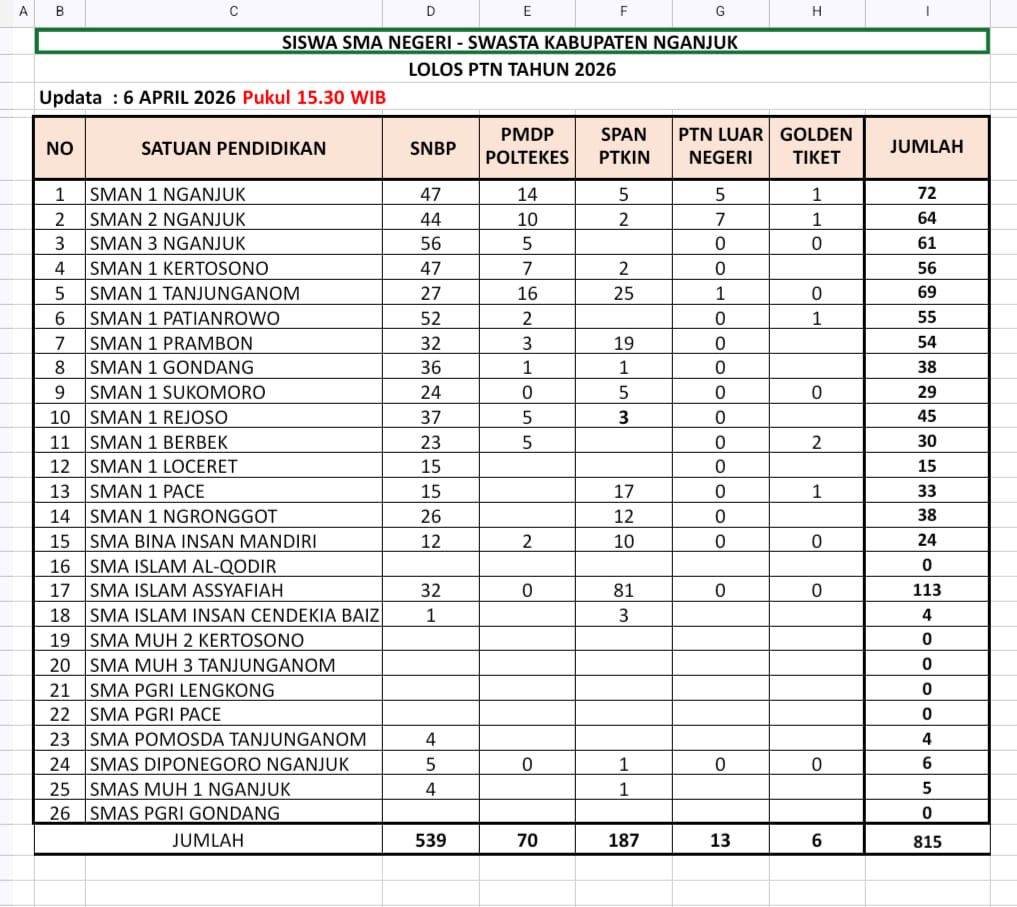 Bagaimana sebenarnya perguruan tinggi negeri menilai siswa? Perguruan tinggi memiliki sistem benchmarking yang membaca rekam jejak sekolah secara lebih utuh—konsistensi akademik, kualitas individu, hingga potensi bertahan mahasiswa di masa depan dengan presatasi dan capaian lainnya yang membanggakan pihak kampus. Kampus-kampus seperti Institut Teknologi Sepuluh Nopember dan Universitas Airlangga tidak sekadar menerima banyak, tetapi menyaring yang paling siap. Jadi, tidak bisa disangkal, SMAN 1 Nganjuk (SMASA) dibawah kepemimpinan DRS. SUGIYONO, M.Si. menunjukkan penguatan dalam kuantitas. Angka SNBP meningkat, stabil, dan mendominasi. Namun pertanyaan pentingnya: apakah dominasi angka otomatis berarti dominasi kualitas?