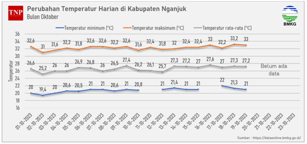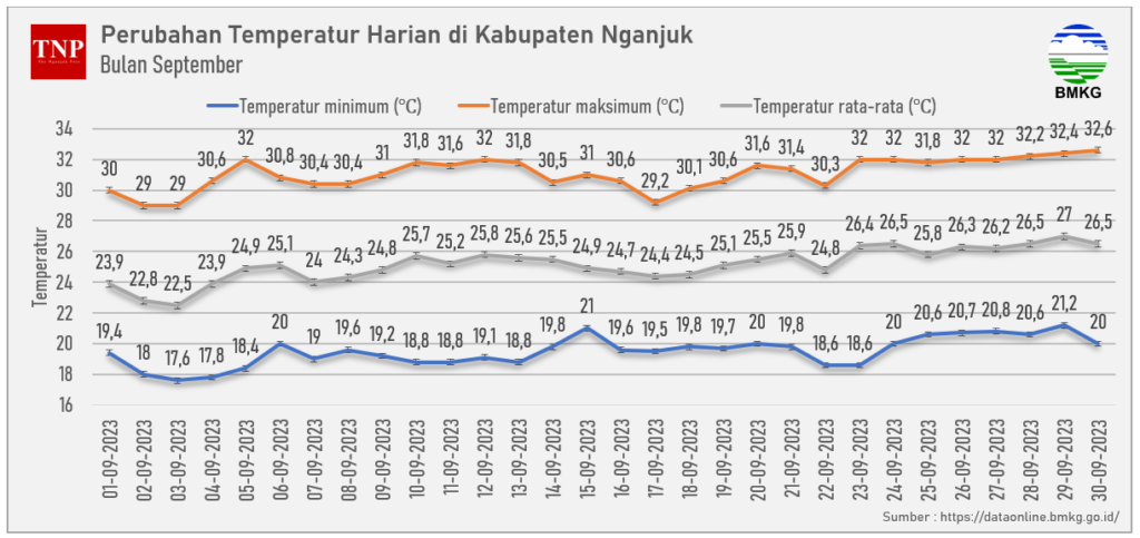 Cuaca memanas ini juga menyengat di Kabupaten Nganjuk, Jawa Timur. Berdasarkan data yang dihimpun oleh Stasiun Geofisika Nganjuk, suhu maksimum di Kabupaten Nganjuk pada awal September adalah 30℃. Pada akhir Oktober, suhu maksimum telah mencapai 33℃. Kenaikan suhu yang cukup signifikan ini tentu menjadi perhatian bagi masyarakat. Masyarakat dihimbau waspada akan dampak cuaca panas yang berkepanjangan ini.