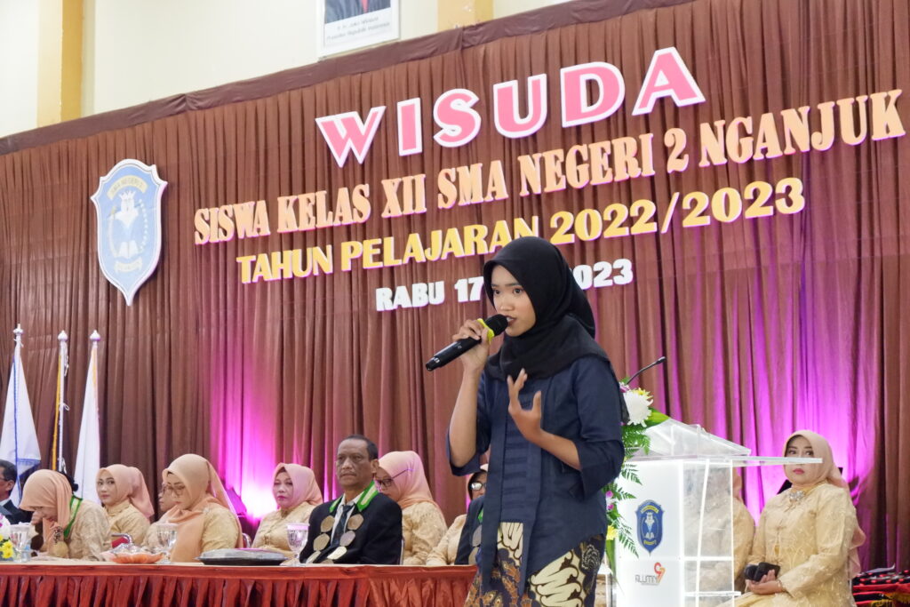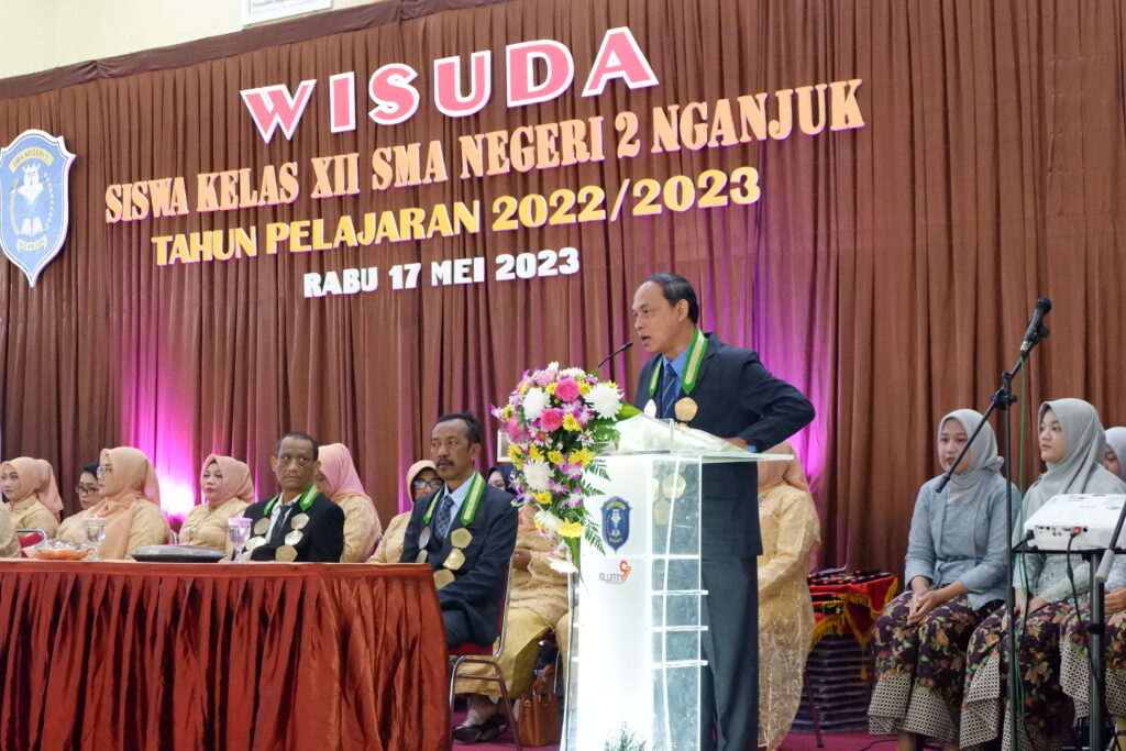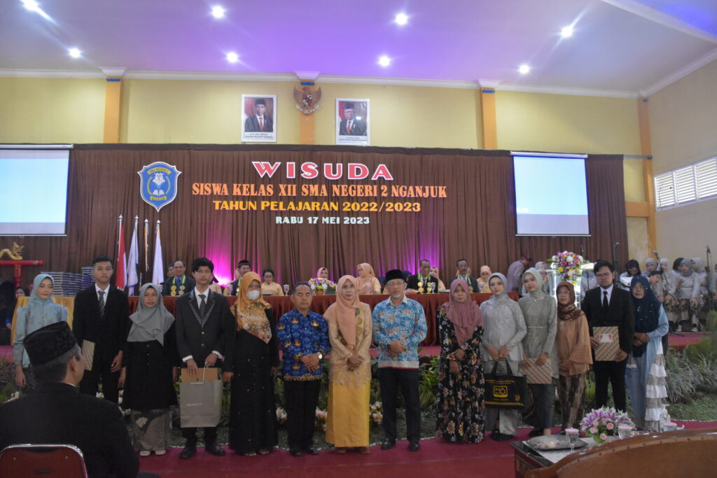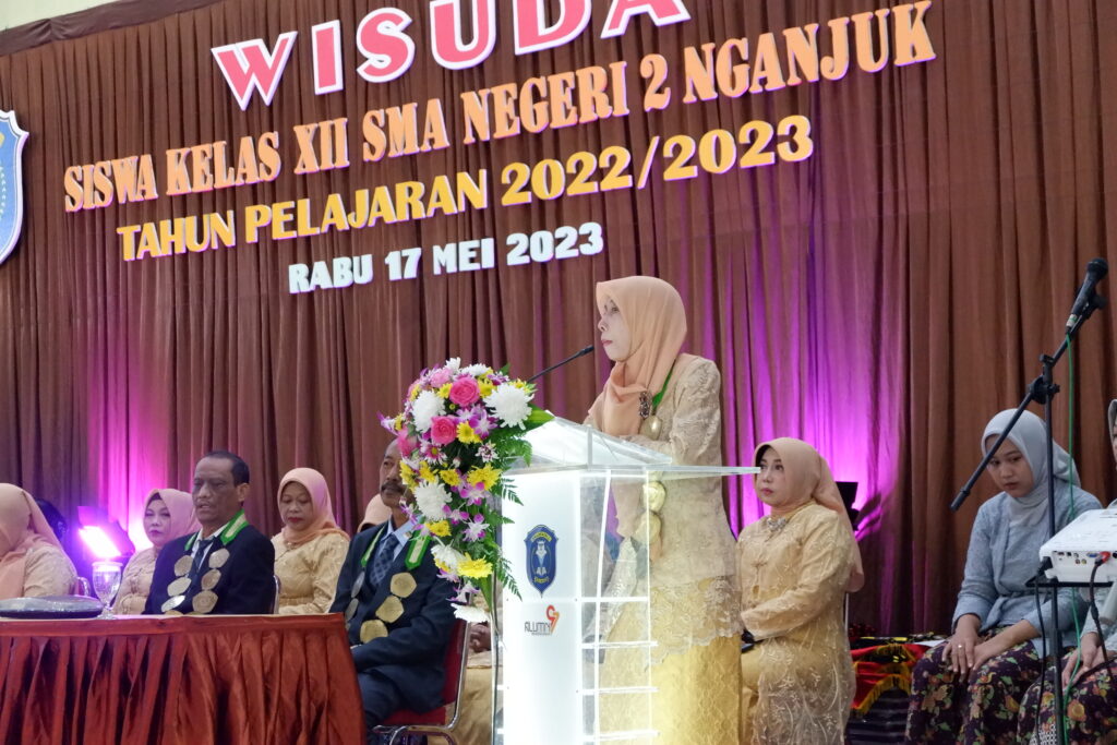 Dr. Rita selaku kepala sekolah SMA Negeri 2 Nganjuk memberikan piagam penghargaan dan laptop kepada wisudawan berprestasi.