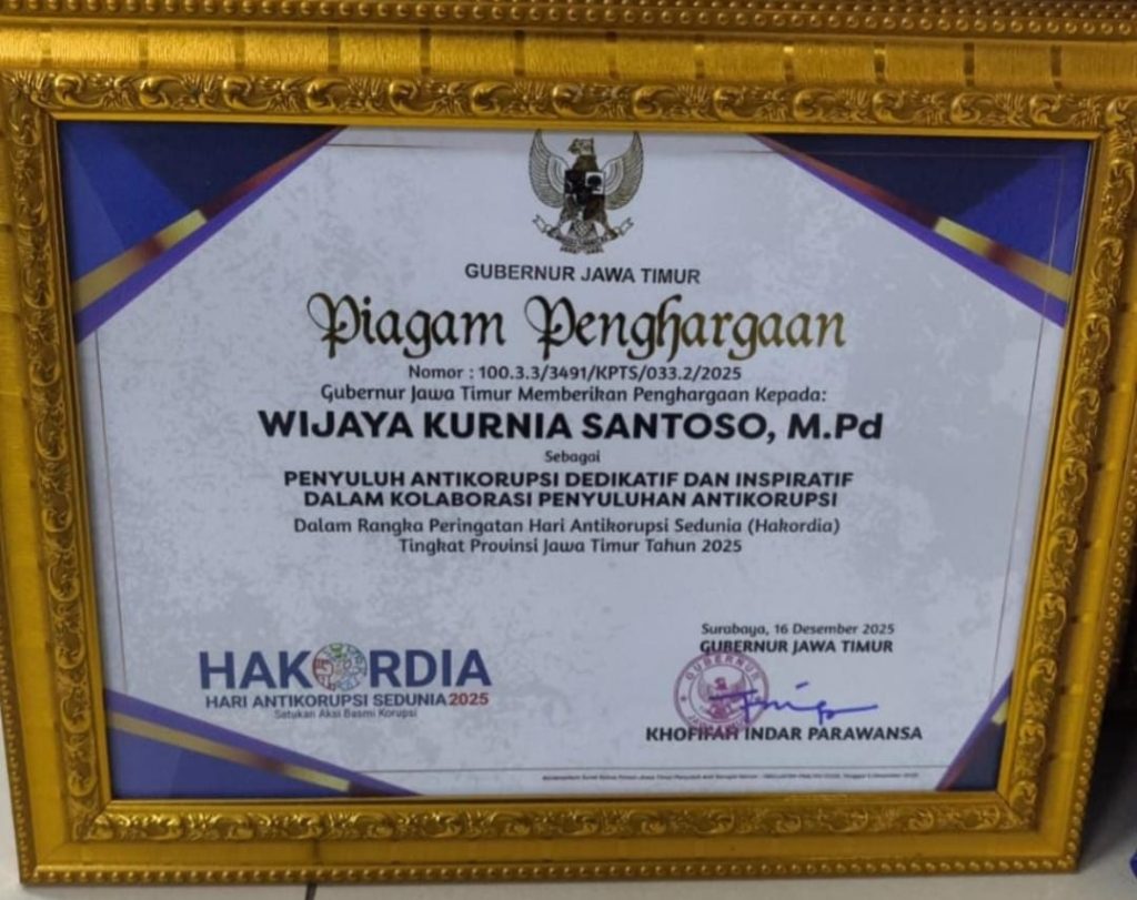 Pemprov Jatim memberikan penghargaan kepada Wijaya Kurnia Santoso sebagai Penyuluh Antikorupsi Dedikatif dan Inspiratif pada peringatan Hari Antikorupsi Sedunia (Hakordia) Jawa Timur 2025, Selasa (16/12/2025). Penghargaan ini diberikan atas kontribusinya dalam membangun kolaborasi penyuluhan antikorupsi yang berkelanjutan dan inspiratif. Penghargaan tersebut diserahkan dalam kegiatan Rapat Koordinasi Hakordia 2025 yang dihadiri seluruh Bupati/Wali Kota dan Inspektur se-Jawa Timur, Forkopimda Provinsi Jawa Timur, Kepala Perangkat Daerah, Direktur BUMD, serta undangan lainnya. Acara berlangsung di Grand Empire Palace, Jalan Blauran, Surabaya.